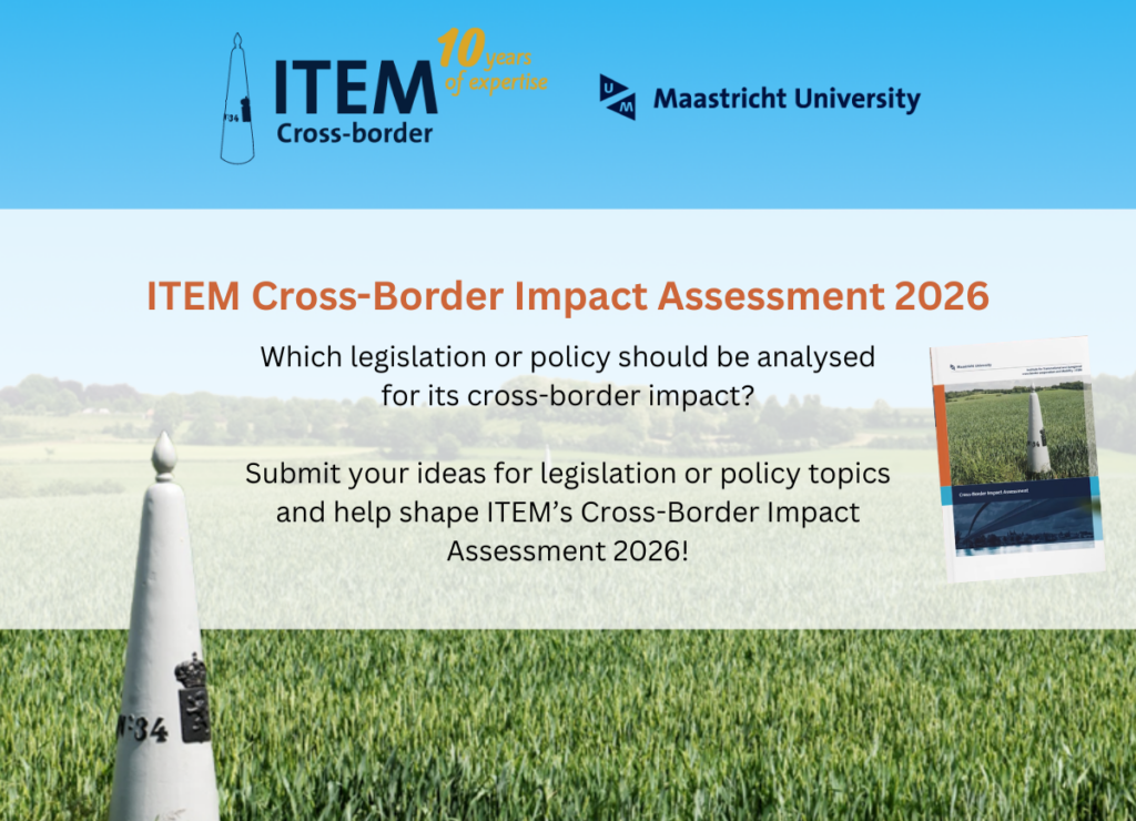 This survey invites policy makers, administrators, (academic) experts, and practitioners in the field of transnational and cross-border mobility to submit your suggestions for a topic(s) for ITEM Cross-Border Impact Assessment 2026. Notably, the suggestion must concern a piece of upcoming or existing legislation or policy that you consider relevant and whose (potential) cross-border effects or impact on border regions should be researched in more detail in the coming year.